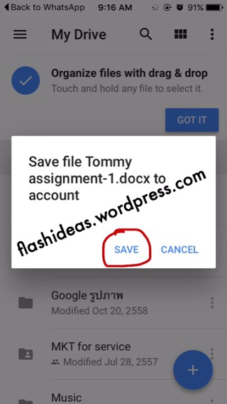 ทีนี้ เพียงแค่เรามีแอพ Google Drive ก็สามารถอัพโหลดไฟล์จากคอมเก็บไว้ แล้วมาแชร์ต่อในมือถือได้เลย หรือจะอัพไฟล์ที่คนอื่นส่งมาตรงไปที่ไดร์ฟเลยก็ยังได้