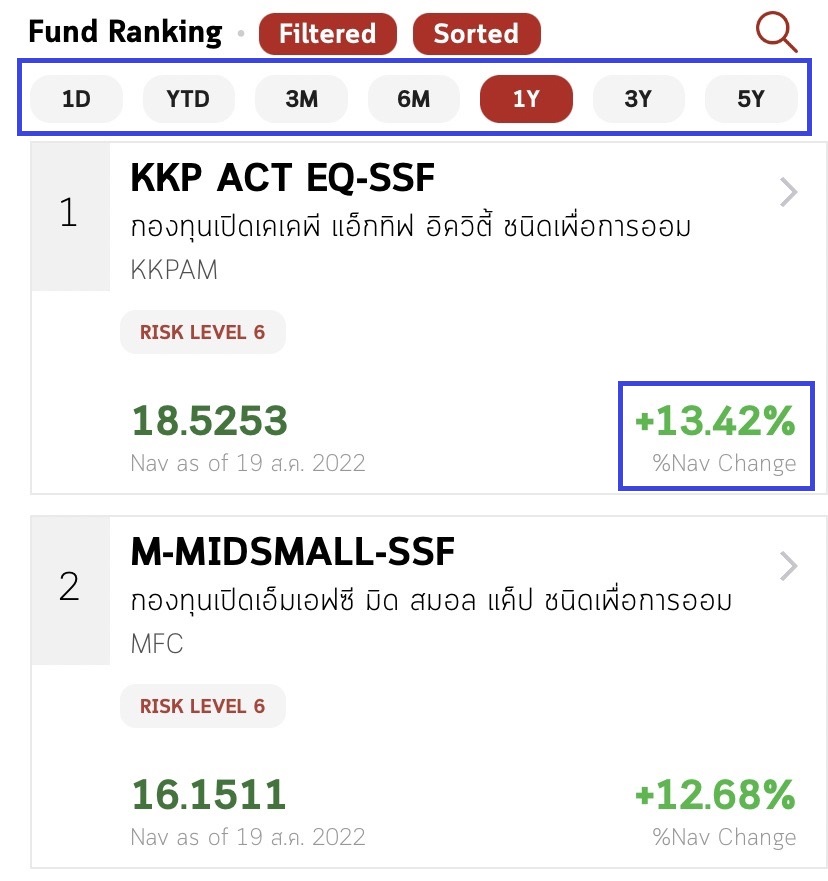 2. ดูผลงานตรง %Nav Change ตามระยะเวลาที่เราต้องการจะลงทุน ยกตัวอย่างเช่น เราต้องการซื้อกองทุนเพื่อลดหย่อนภาษี ซึ่งตอนถือนาน 10 ปี ก็ควรเลือกที่มีให้ดูสูงสุดคือ 5 ปี *ส่วนในกรณีด้านล่างเนื่องจาก SSF เป็นกองทุนที่พึ่งมีมาไม่นาน ทำให้ดูได้นานสุดคือ 1 ปี