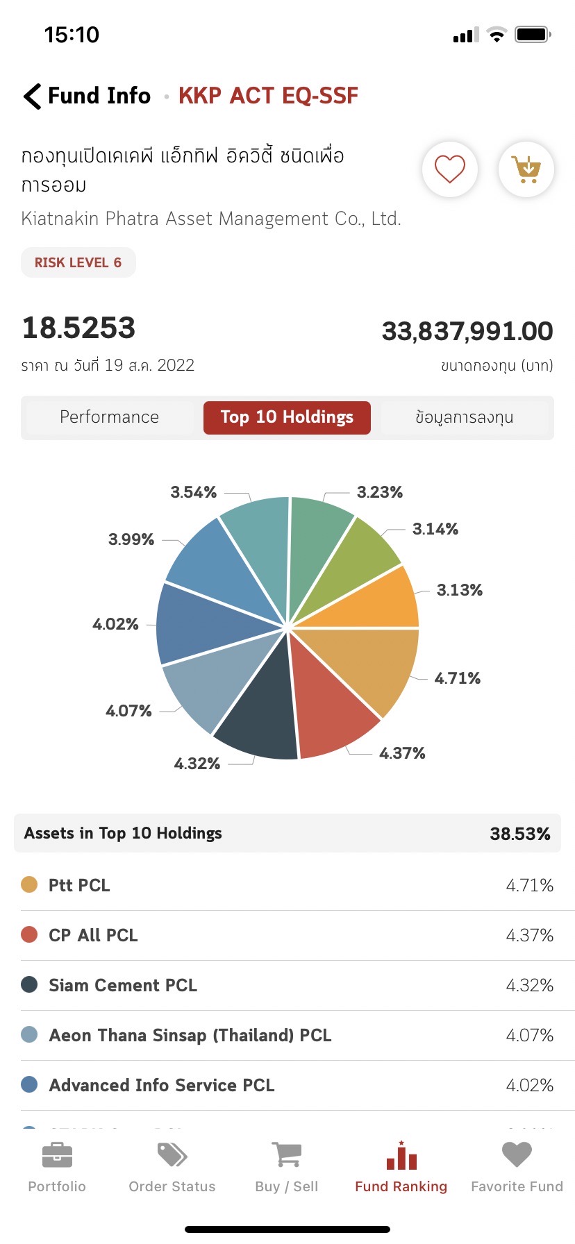 - Top 10 Holding – เข้าไปดูเราจะเห็นว่ากองทุนที่เราถืออยู่นั้นลงทุนในอะไรบ้าง ในสัดส่วนเท่าไหร่ ทำให้สามารถไปเช็คข้อมูลบริษัทเหล่านั้นได้เพิ่มเติมว่าจะสามารถมีผลประกอบการที่ดีและถือในระยะเวลาที่ต้องการได้รึเปล่า ปล.ตรงนี้อาจจะดูคร่าวๆก็ได้ค่ะ เน้นเป็นแนวทางว่ากองทุนที่เราถือลงทุนสไตล์ไหน เพราะระหว่างทาง กองทุนเองจะมีการปรับพอร์ตเพื่อบริหารจัดการความเสี่ยงด้วยตัวเองอยู่แล้ว